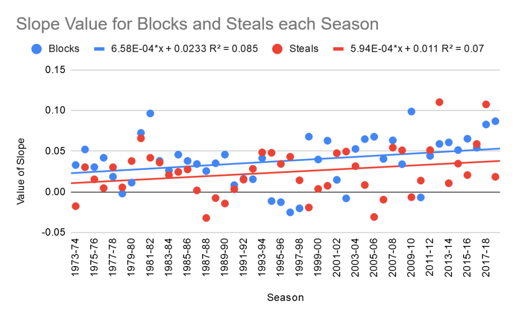 We have the overall picture of how the correlations look for all seasons combined, and we can also look at how they change from season to season. First, we look at the slopes (win percentage vs adjusted blocks/steals) over time: