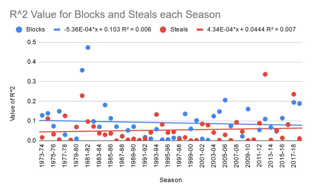 In this case the steals seem to have improving correlations over time while blocks have decreasing correlations over time. However, the two outliers in 1981 and 1982 could be what causes the trend-line for blocks to slope downwards. Either way, at least up to now the trend-line for blocks is higher, meaning that overall there has been a stronger relationship with blocks and win percentage as opposed to steals and win percentage.