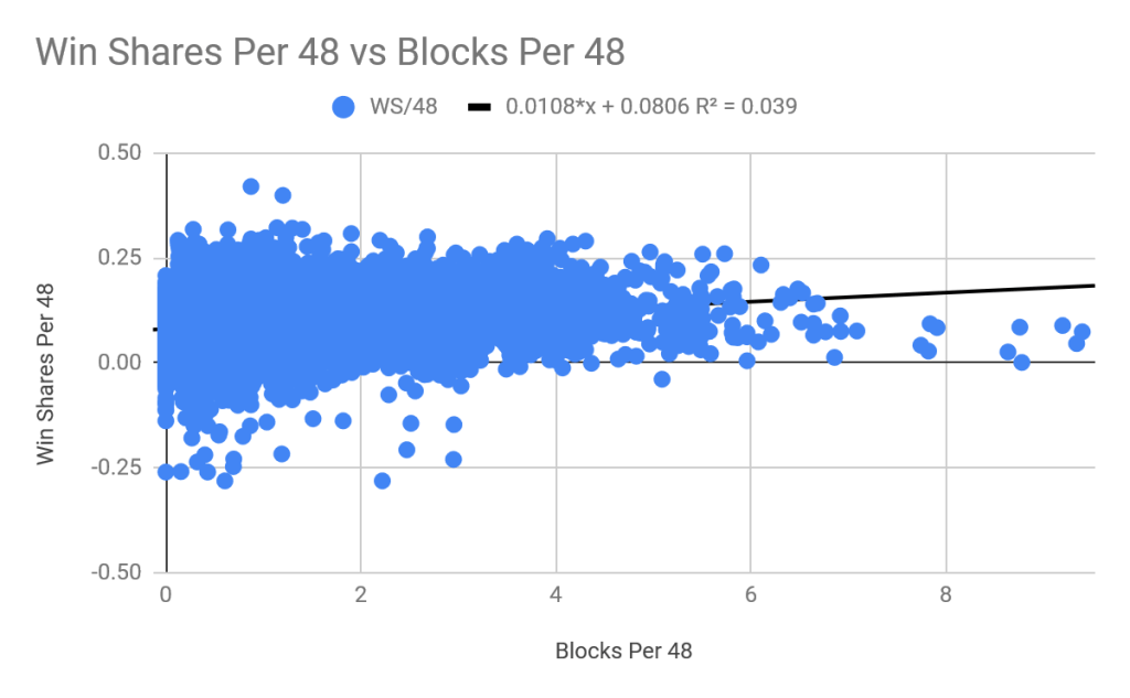 We get an R2 value of .039, meaning that there is a positive but not very significant correlation. Once a player averages 3 or more blocks per 48 they almost always have positive win shares. That said, none of the all time leaders in blocks per 48 were leaders in win shares per 48, meaning that blocks might not matter much after a certain extent. Although the relationship isn’t that strong, it is much better than that of steals.