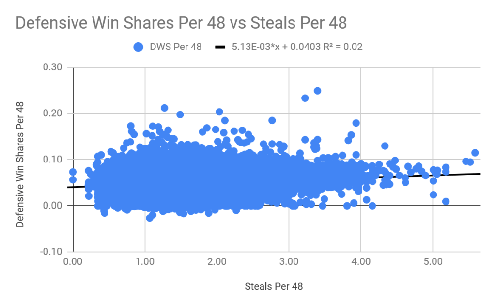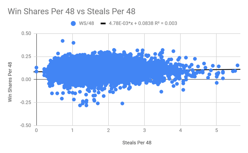 Amazingly, just like with overall win shares, the correlation with defensive win shares per 48 is 1/10 as strong for steals as it is for blocks. There is still a positive correlation, but it is much weaker. Similarly to blocks, after a certain point, enough steals always means positive defensive win shares. Also, the all time leaders in defensive win shares per 48 weren’t all time leaders in steals per 48 or blocks per 48. Still, it’s clear that blocks win this battle.