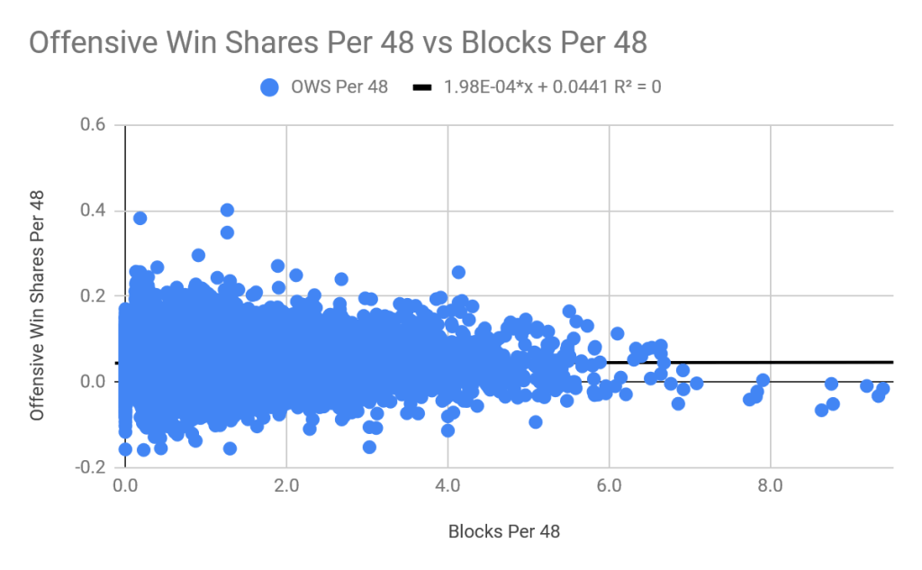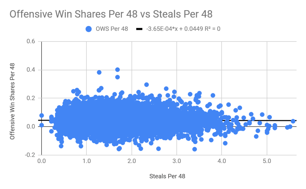 Just like for blocks, the R2 value for steals rounds down to 0. Therefore, neither stat has any correlation with an individual player’s offensive success. Like blocks, for every level of steals per 48, the average offensive win shares per 48 doesn’t change by any significant amount.
