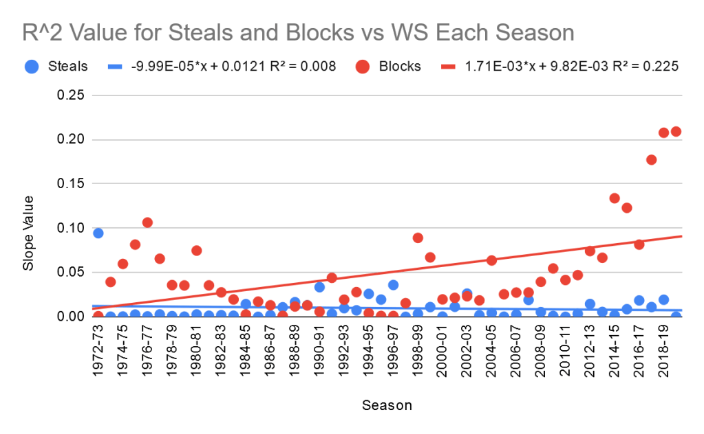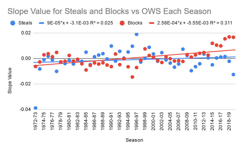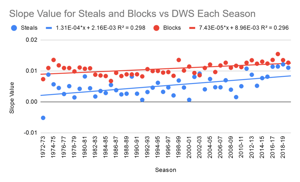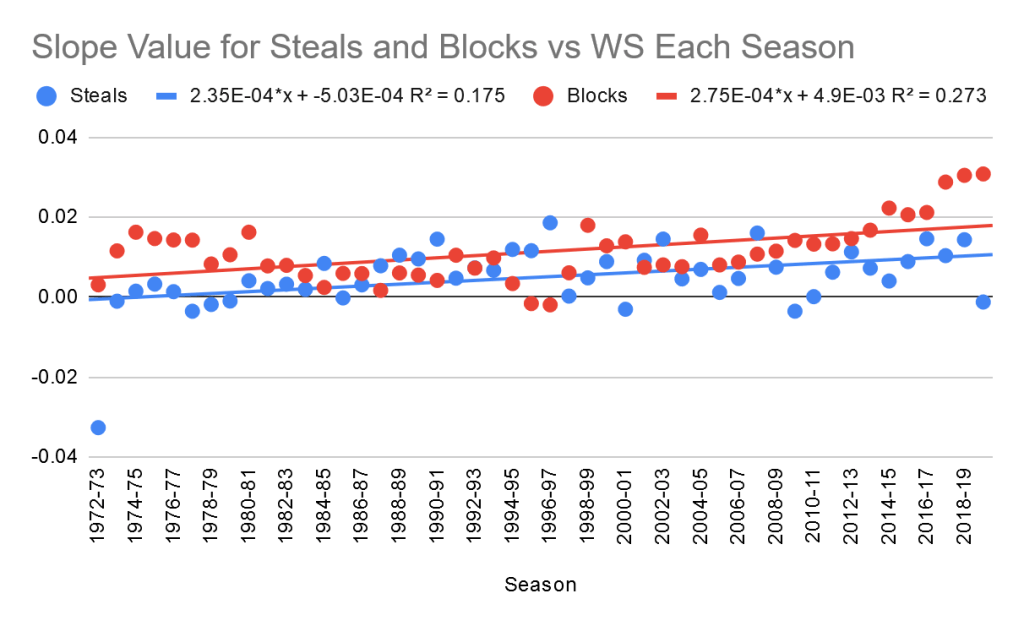 Amazingly, the slope for blocks is higher in ever season except for 2002-03, making it even more convincing that blocks have a higher value. The value of blocks and steals both seem to be going up over time, with steals increasing faster. This means there’s a chance that steals could overtake blocks in the coming seasons, but for now blocks are clearly more valuable when it comes to defensive success.