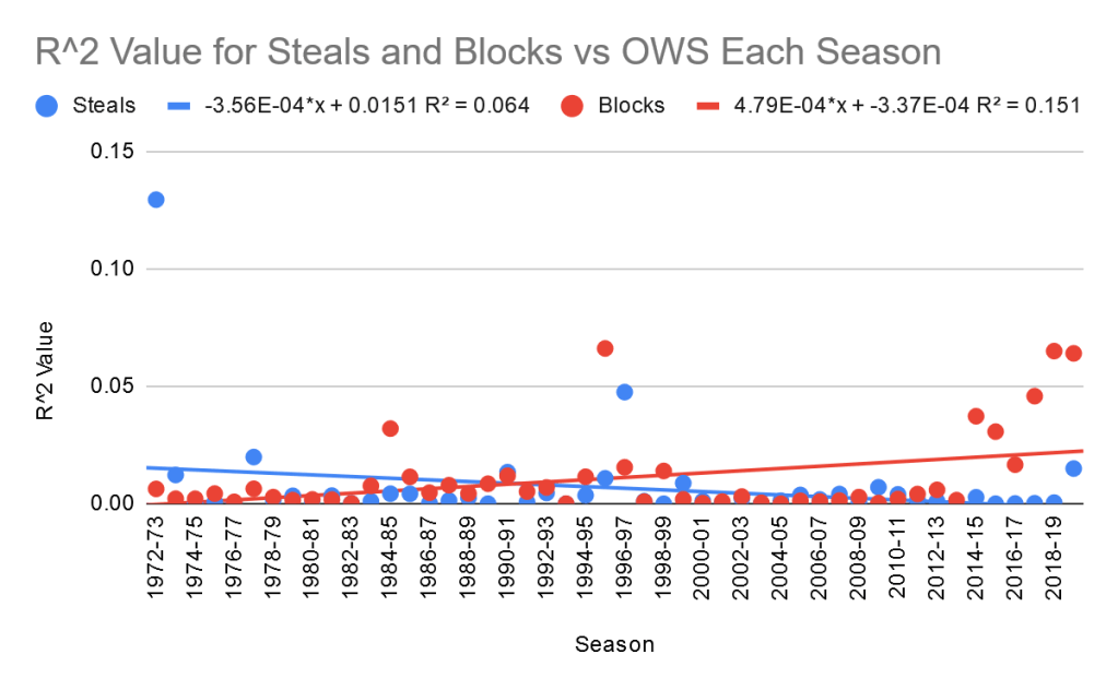 Looking at the R2 values, the correlations for blocks dwarf the correlations for steals. Additionally, the correlations for steals don’t seem to be improving at all. On the other hand, the correlations for blocks have been consistently rising this decade, with a spike happening in the past 6 seasons. Not only are blocks ahead, but they’ll likely continue to widen the gap.