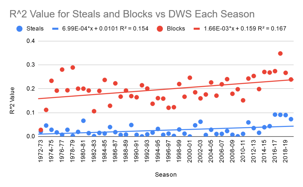 Even more amazingly than the slopes, when it comes to defensive success, blocks have much higher correlations each and every seasons than steals do, and it’s not even close. The correlations for both seem to be increasing slightly over time, and blocks are increasing faster in addition to already being ahead. Interestingly, although we saw spikes in the values and correlations of blocks in the past 6 seasons when we looked at total win shares and offensive win shares, we don’t see any of this when it comes to defensive win shares. This means that the recent spike in the value of blocks is coming entirely from offense, not defense. The cause of this spike is not clear, since there haven’t been any notable rule changes that occurred this decade. Still, it’s clear that blocks are dominant over steals.