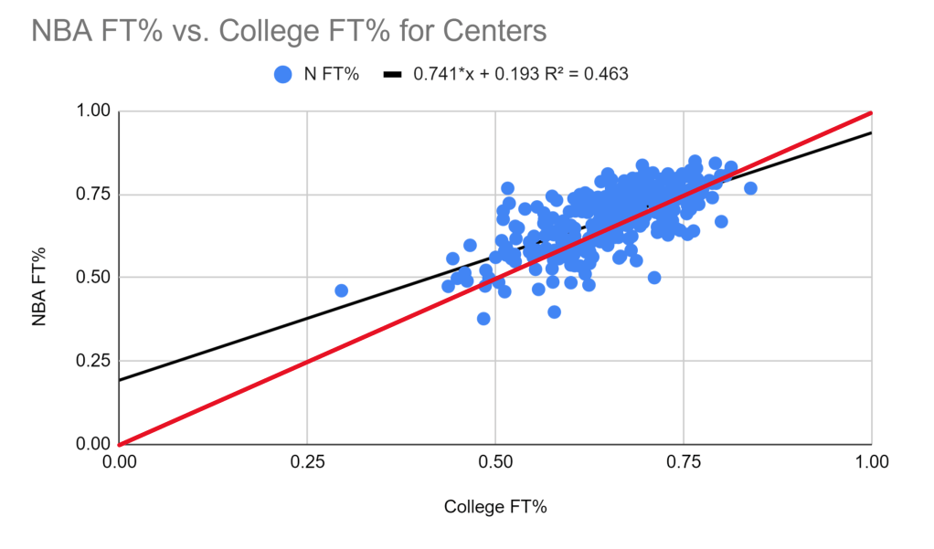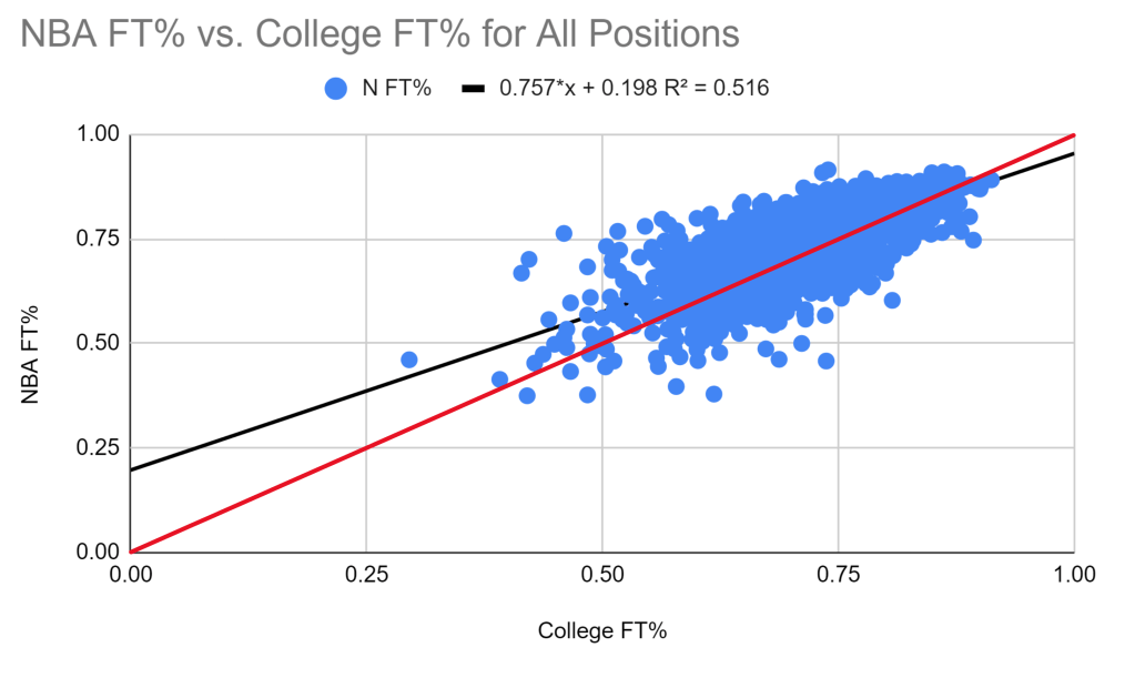 We see that the majority of players fall above the red line, indicating that players generally are able to improve their free throw percentage when entering the NBA. However, plenty of players fall below the red line, meaning they got worse. we also have an R2 value of 0.517, which indicates that while there is a decently strong correlation between college and NBA free throw shooting percentage, there’s still a lot of variation in how much players get better or worse.