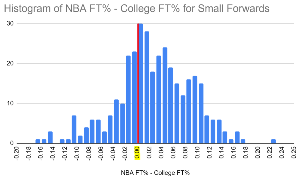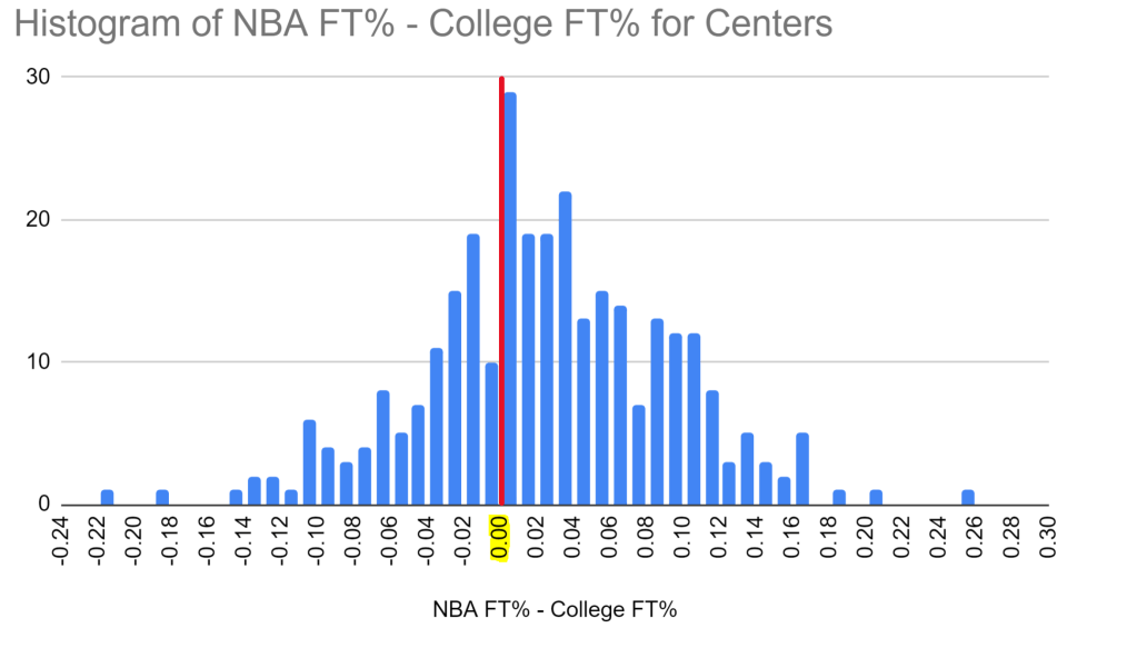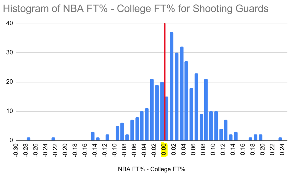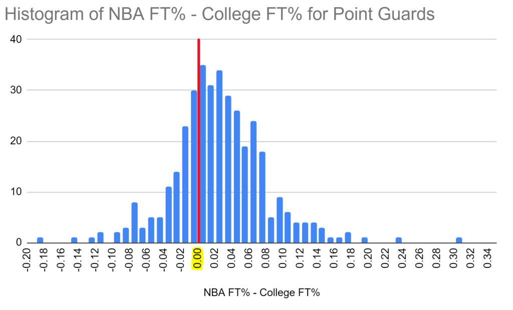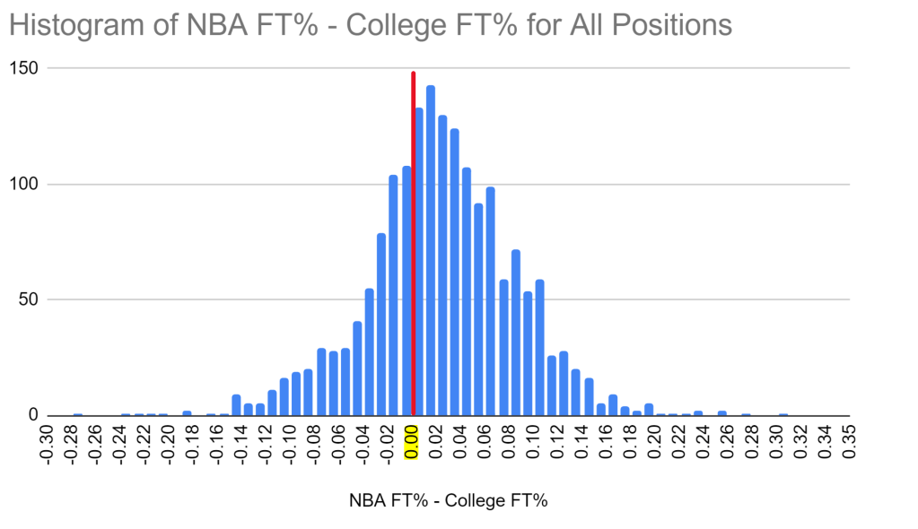 To better visualize the distribution of how players are getting better/worse, we can look at a histogram of the difference between a player’s NBA FT% and their College FT%: