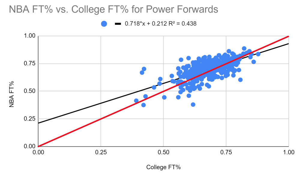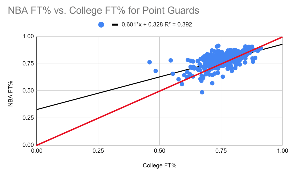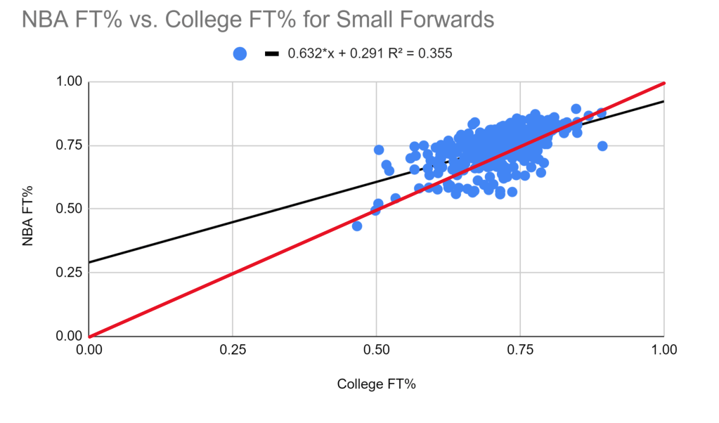 In each of the scatter plots, the red line is the graph of y = x, which represents an equal shooting percentage in the NBA and in college. Being above this line is indicative of improving one’s shooting percentage when entering the NBA, and being below the line means that the player’s shooting percentage decreased.