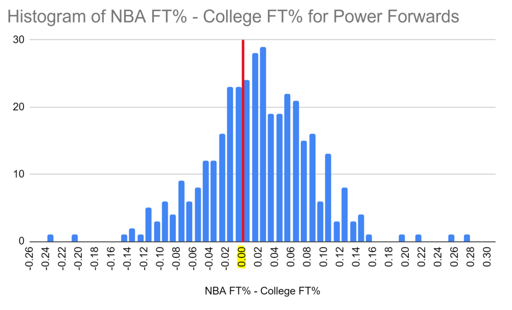 We get a distribution centered closer to 0, with only 63% of small forwards increasing their FT%, the worst for any position. The shooting percentages are also lower than all prior positions, with power forwards shooting an average of 70.2% on free throws in the NBA, which is an average improvement of 1.9% from college (also the worst for any position).
